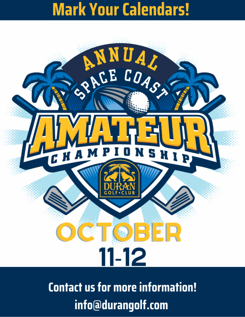 The Annual Space Coast Amateur Championship is coming to Duran Golf Club on October 11–12. This 36-hole stroke play event is open to golfers with an established USGA handicap and includes special practice round pricing. The $150 entry fee ($100 for Duran Signature Members) covers two rounds of golf, practice balls, Sunday lunch, and prizes. The last day to register at Duran is October 5th. Register online or contact info@durangolf.com for details!